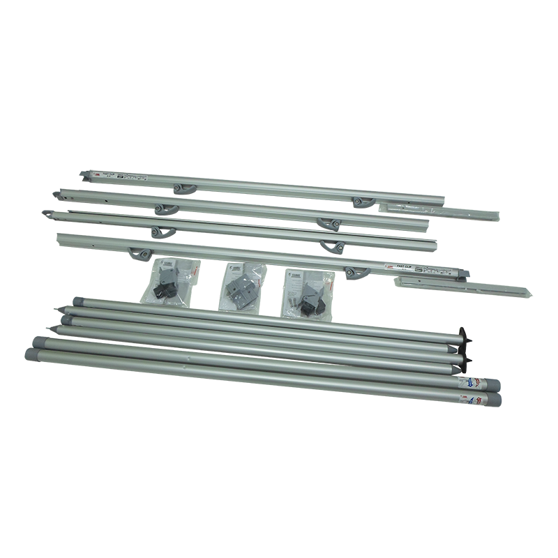 In order to guarantee a perfect seal the fabric of the awning is blocked between the hinged lower rail and the upper rail by internal easy clamps. The Fast Clip is delivered with two vertical poles that are fixed between the side panels and the vehicle wall.